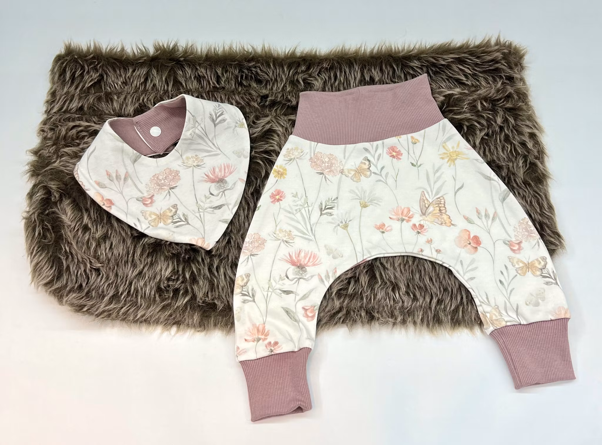Kjekk barselgave? Baggy bukse som gir godt bevegelsesrom for barnet, med matchende smekke. Begge deler sydd i jersey/ribbjersey. Tilgjengelig i str 50/56, 62/68 og 74/80, men kan også sys i større størrelser.
